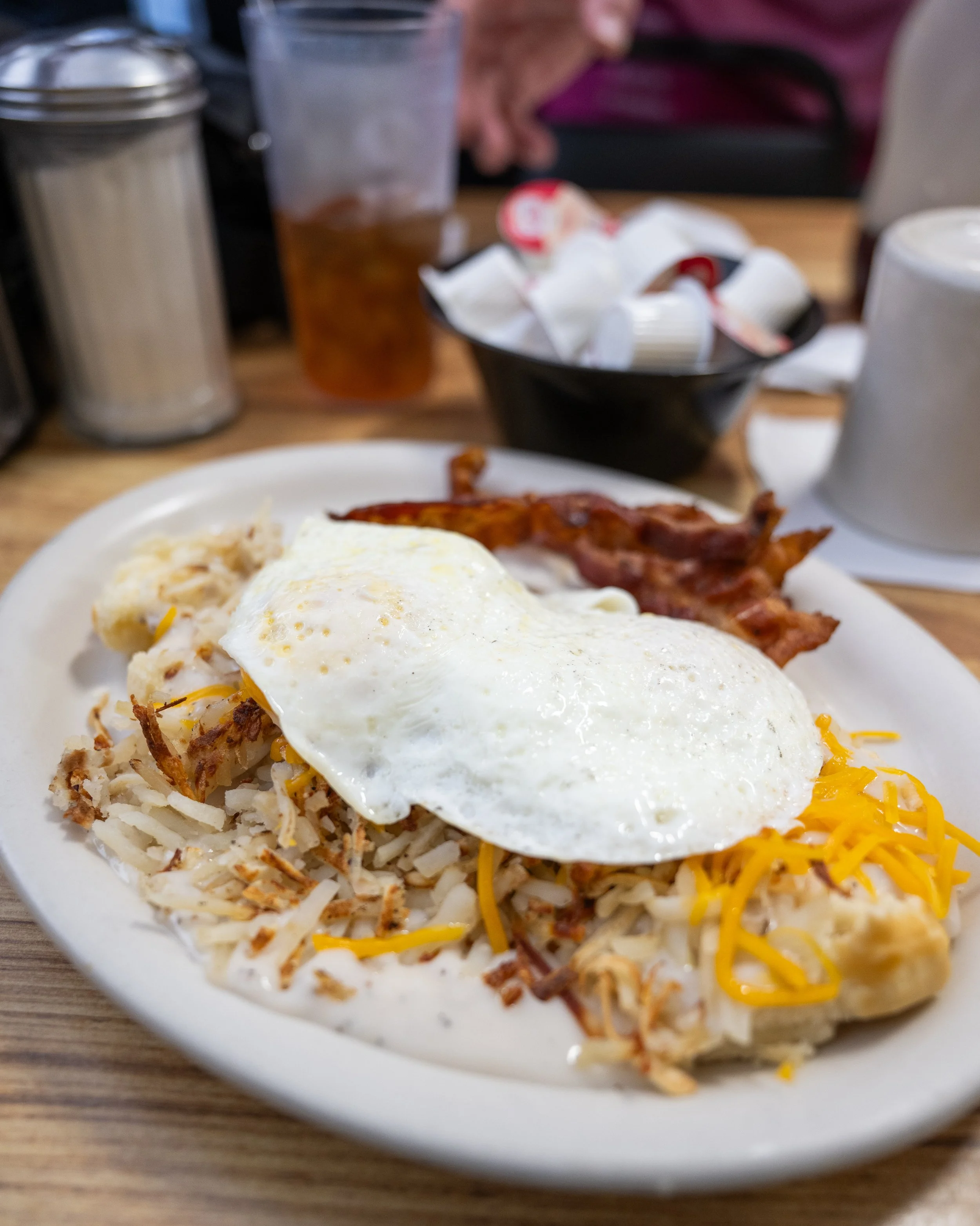 Mitchell’s Mayhem (eggs over easy, bacon, shreds crispy)